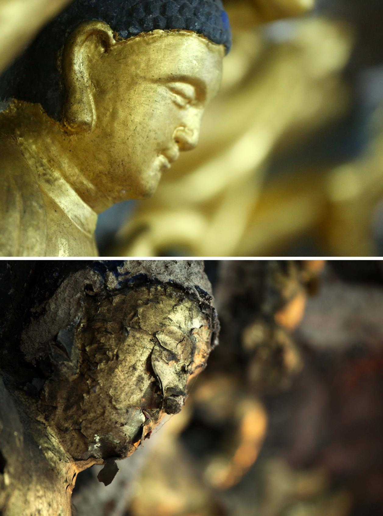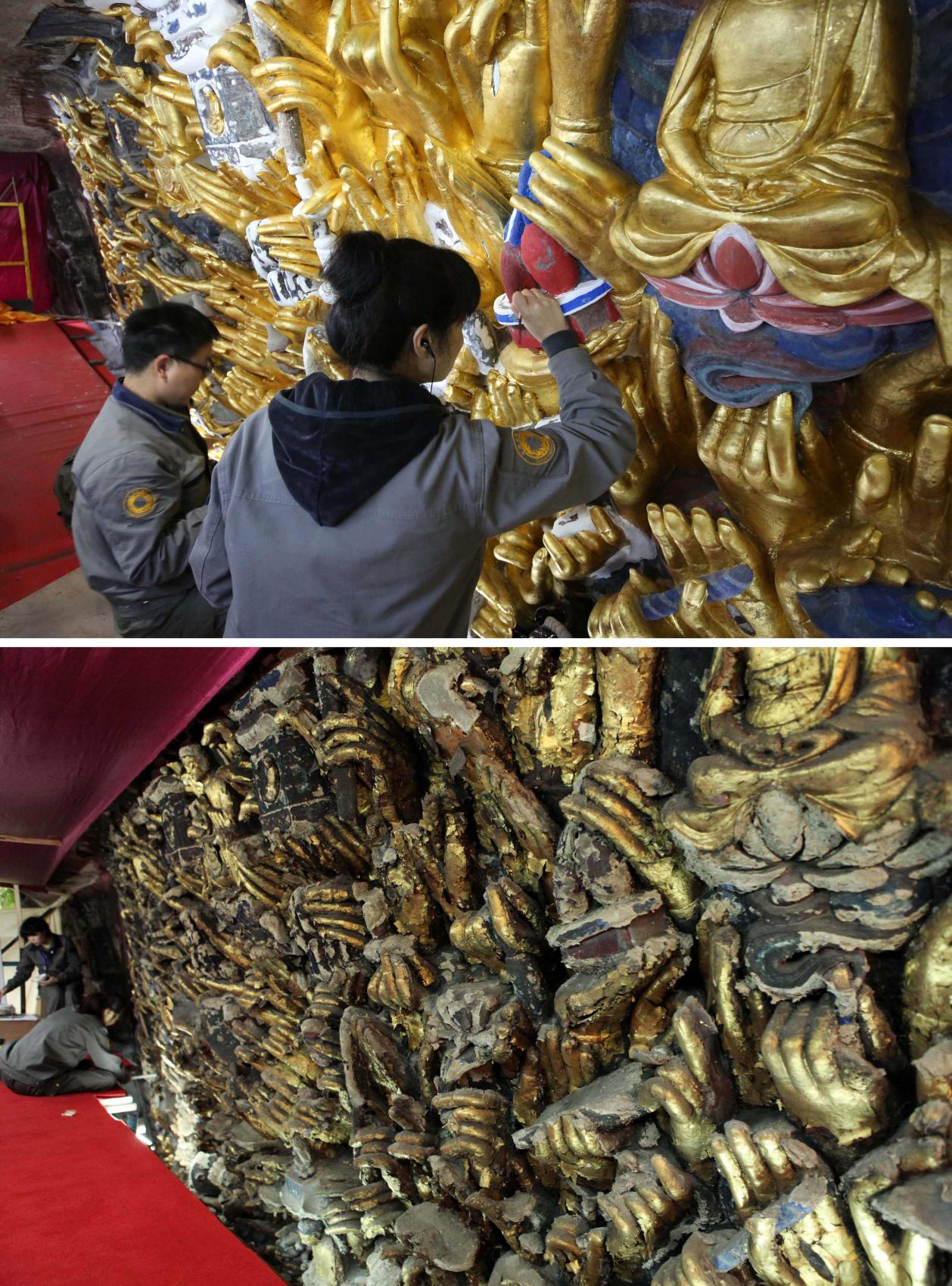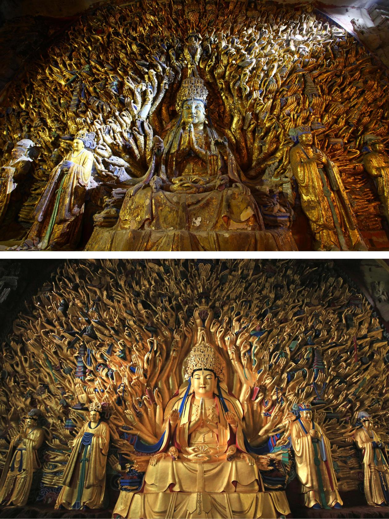 该保护工程遵循的原则:依据历史雕凿工艺痕迹,按照自上而下、由外至内、由易到难程序,逐步开展造像本体砂岩、贴金层与彩绘层修复工作。整个工程涉及造像石质、彩绘、金箔三种材质34种复合病害,展开面积约220平方米。保护修复工序包括:一是造像本体除尘、不稳定金箔层揭取及处理、裸露岩体脱盐、风化石质加固、空鼓石质灌浆、断裂石质粘接、残缺石质补形;二是石质表面贴金层回贴加固、髹漆、贴金箔、协色、全色;三是彩绘清洗、回贴、加固、补色等数十项内容。