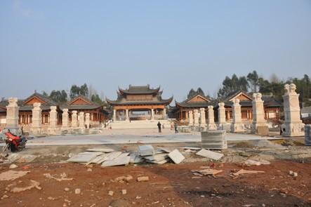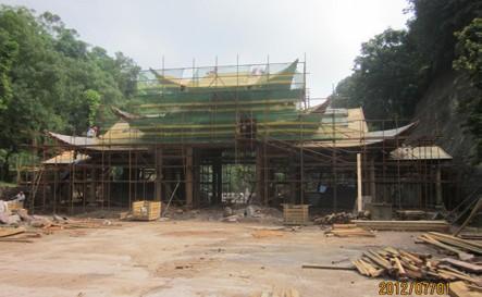 该工程由常熟古建建设有限公司施工,于 2013 年 3 月开工,次年 3 月 14 日完工。工程内容包括修建单层木结构仿古建筑群1 座,包括正门大殿、祈佛殿、售票厅、讲解服务厅,以及配套管理、服务用房,建筑面积 3489 平方米。其中,大门正殿为敝开式,以 4 根整石青狮、白象柱支撑。