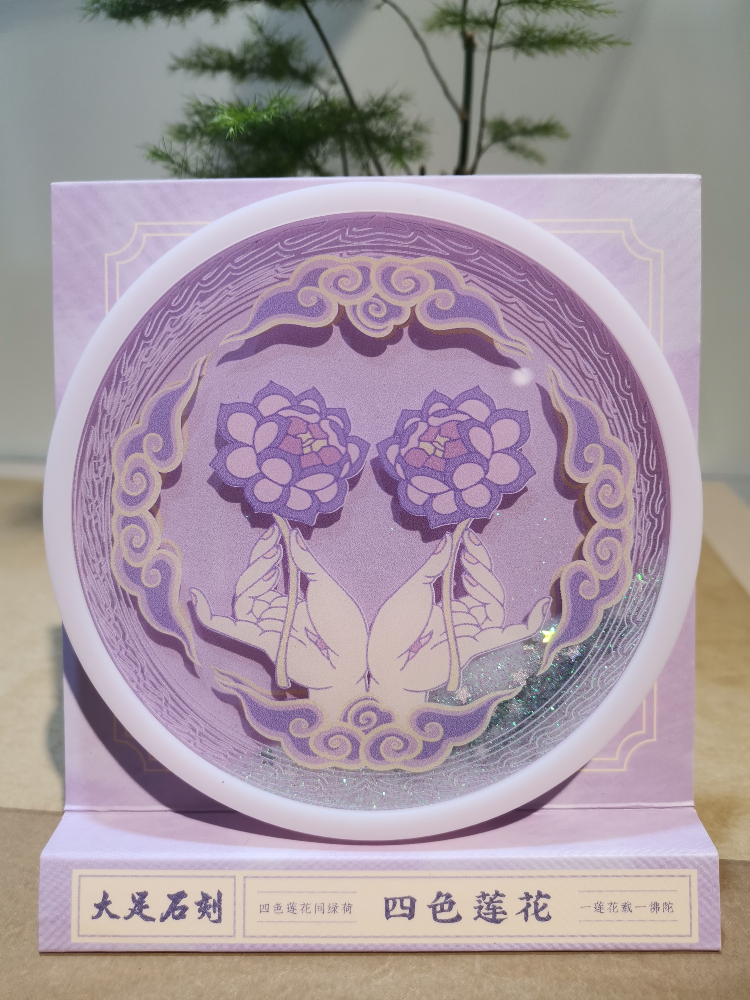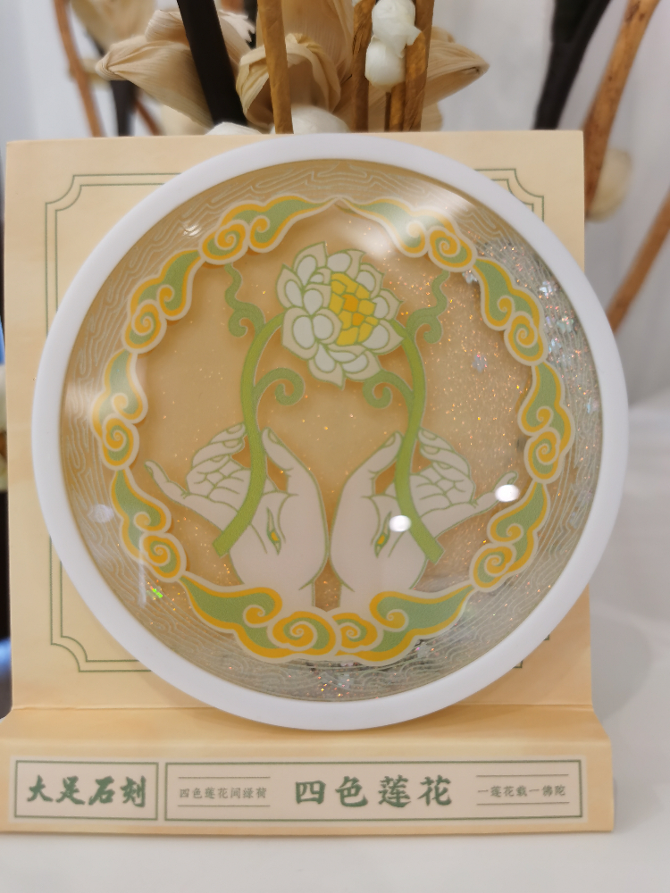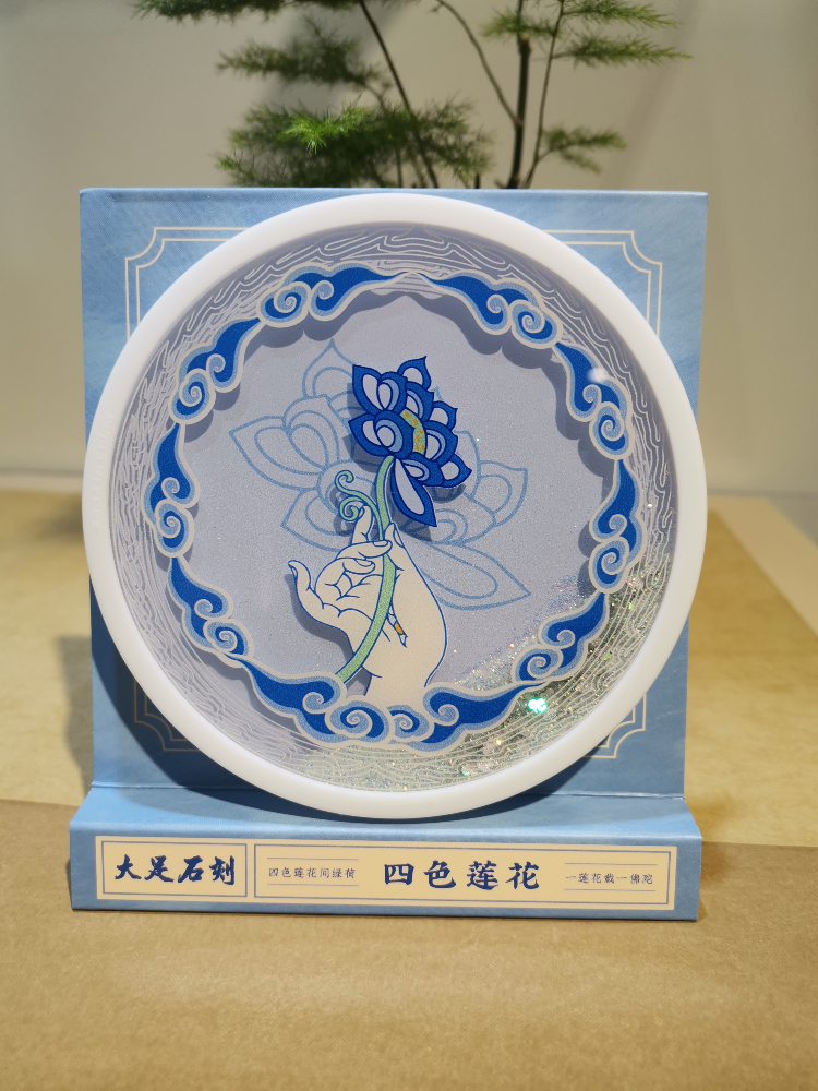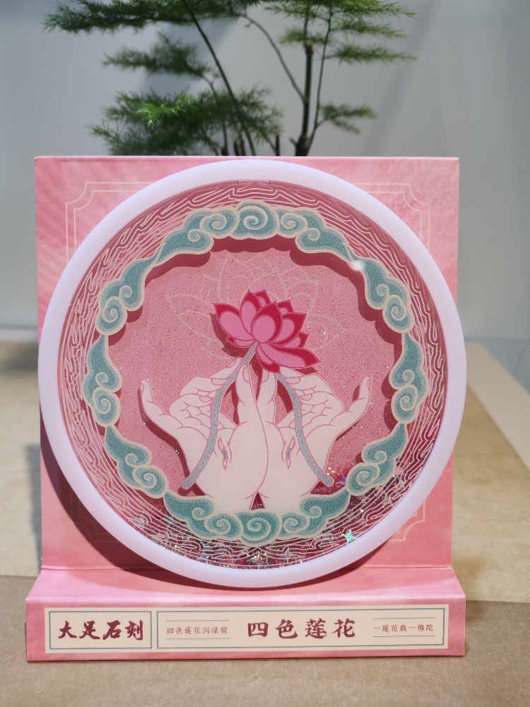 相传莲花是佛教的吉祥之花,具有吉祥、圣洁之意。本四款四色莲花流沙杯垫,将莲花与大足石刻手印相结合,清新雅致,象征着烦恼像流沙般,一点点地从指缝间流走。