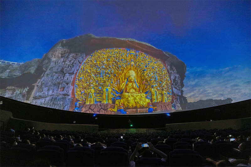 2022年,新规划的大足石刻数字展示接待中心建成投用,以最新影像制作技术拍摄的一部球幕电影《大足石刻》正式上线。影片拍摄方式采用实景拍摄、历史场景的情景再现拍摄和类实景拍摄相结合,特别是“类实景拍摄”,它把真实的现实空间转换成数字空间,然后再用电影方式进行拍摄。这是一项前沿的拍摄方式。因此,8K 球幕主题电影《大足石刻》是对大足石刻艺术价值主题的真实表达,是严格意义上的主题电影艺术风格。