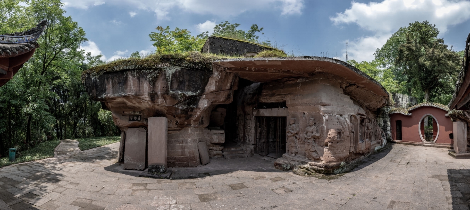 石门山石刻位于大足城区东南20公里的石马镇,开凿于北宋绍圣至南宋绍兴年间(1094—1162),清有少量增刻。造像布置于山顶东侧、西侧和南侧三个相对独立的岩体崖壁上,共编22号龛。此处为释、道合一造像区,尤以道教造像最具特色,故在淳熙九年(1182)邓柽书《石门洞碑》称:“像无定刻、或仙或释、或诸鬼神、千百变见、混为一区。”1999年12月1日被列入《世界遗产名录》。