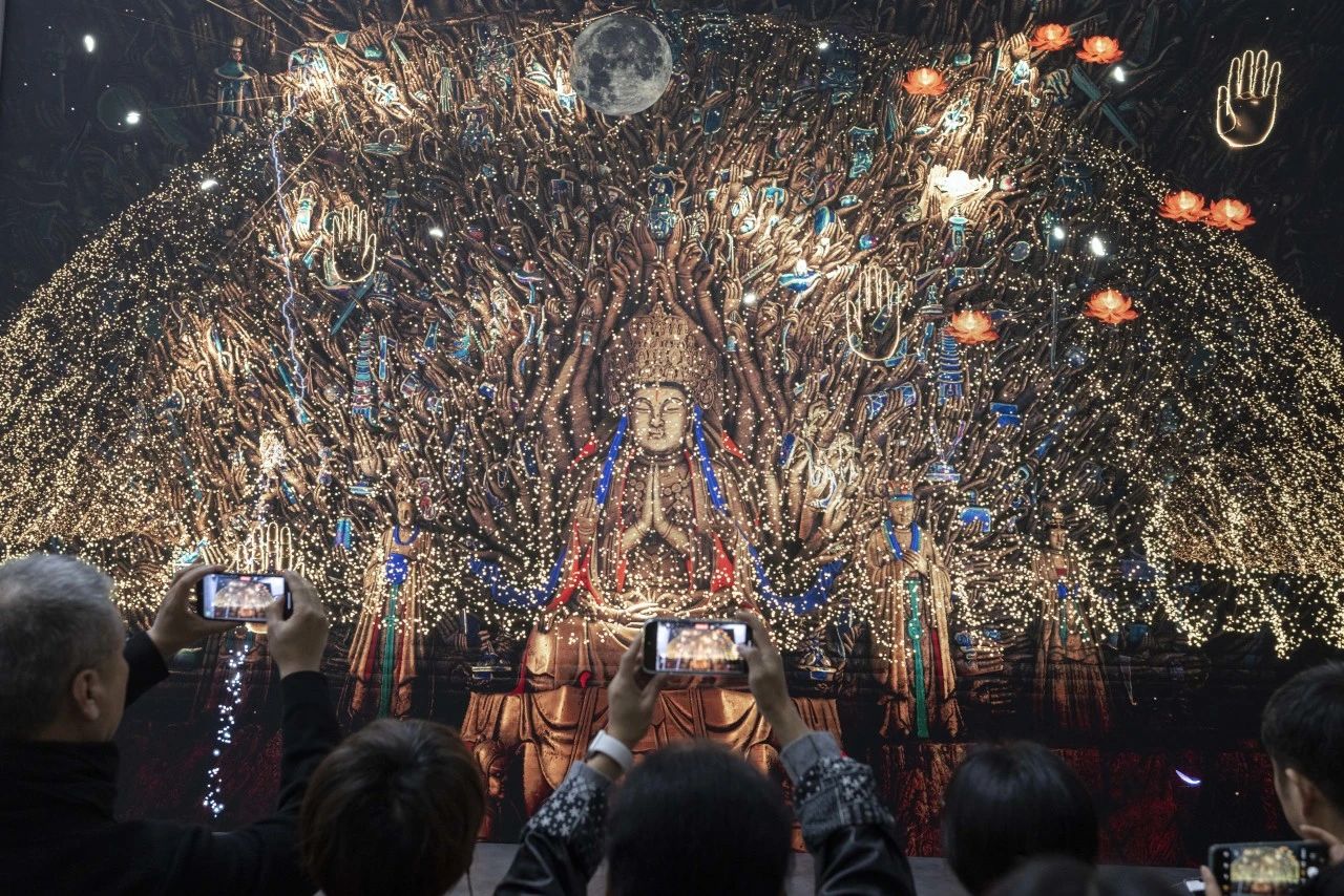 游客正在欣赏运用数字活化技术创作的大足石刻艺术作品