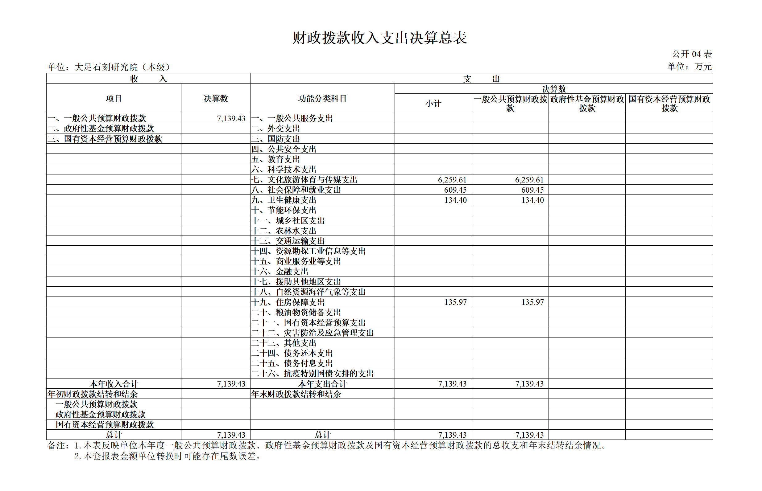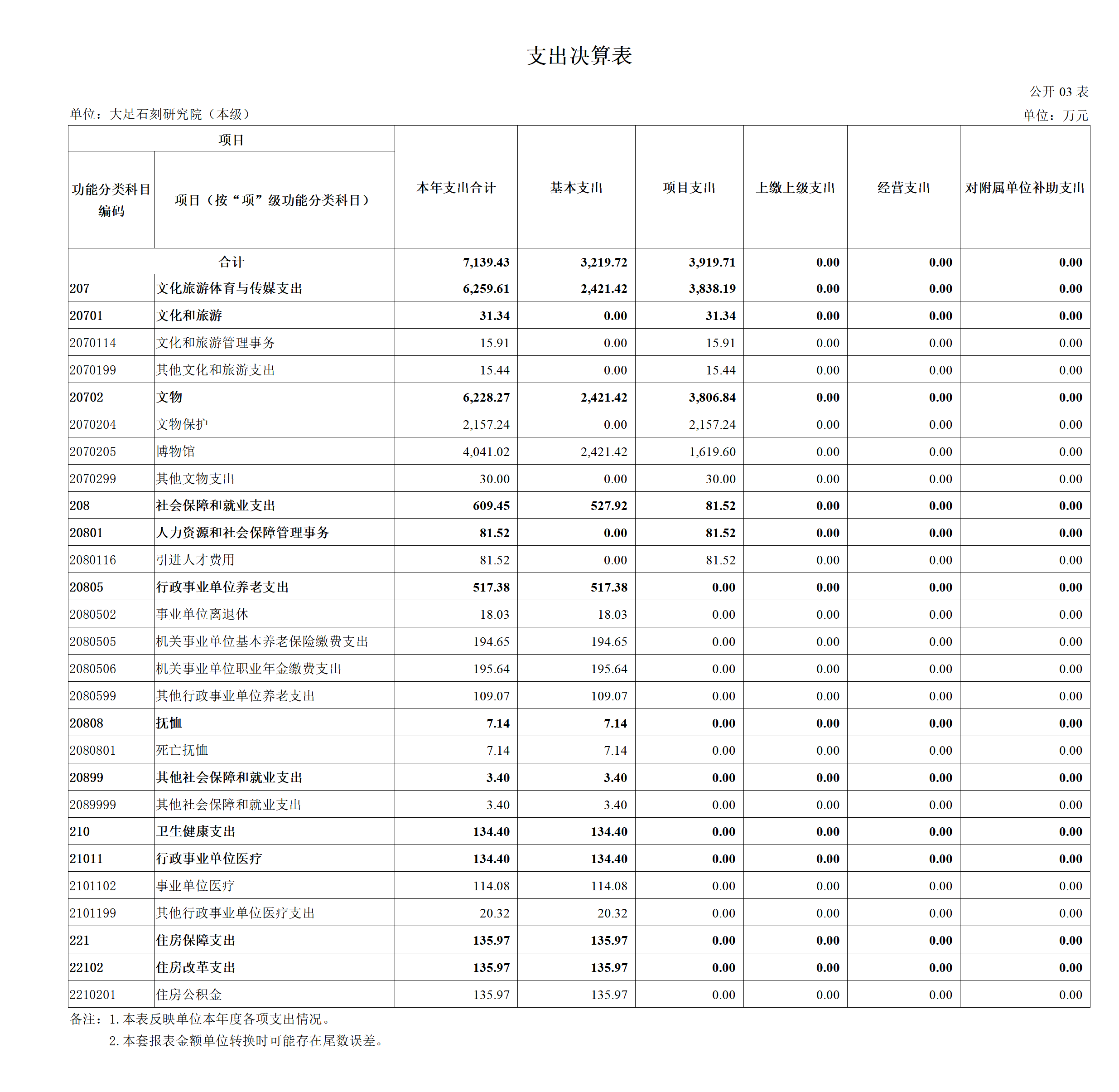 1.收入情况。2024年度一般公共预算财政拨款收入7139.43万元,与2023年度相比,增加907.51万元,增长14.6%。主要原因其一是:新招录14名在编人员,并且根据正常竞聘上岗,调整各项工资福利。其二是:根据三届区人大常委会第二十一次会议通过调整预算,追加了2024年及以前年度中央、市级项目结转资金的拨付。较年初预算数减少1501.75万元,下降17.4%。主要原因是根据大足区第三届人大常委会第十四次会议通过调整预算追减1501.75万元。包括减少大足石刻中小石窟保护设施建设项目(第一期)(第二期)、川渝石窟寺国家遗址公园(重庆片区)总体规划编制、大足石刻宝顶山摩崖造像圆觉洞综合性保护工程、大足石刻北山摩崖造像第176-180号窟段抢救性保护工程、大足石刻北山摩崖造像北段水害治理工程前期勘察研究、大足石刻妙高山摩崖造像抢救性保护工程、大足石刻南山摩崖造像消防工程、巴蜀石窟资料抢救性收集整理与编撰《巴蜀石窟全集》等项目支出、大足石刻石门山摩崖造像抢救性保护工程、中日合作开展大足石刻峰山寺摩崖造像保护项目的支出。此外,年初财政拨款结转和结余0万元。