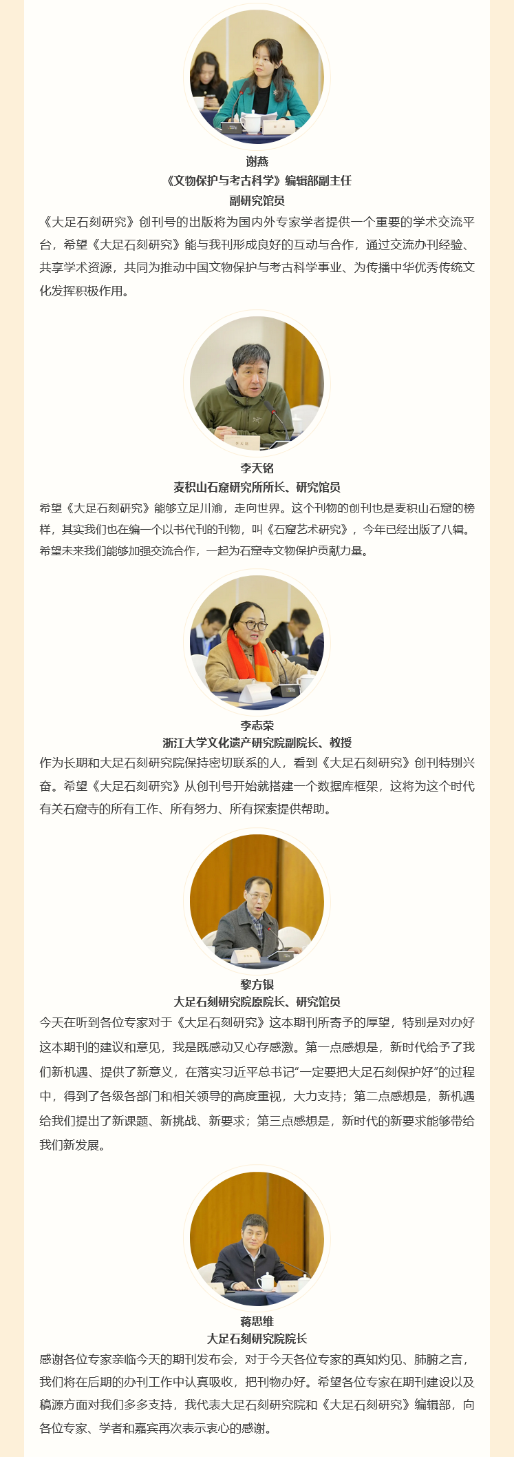《大足石刻研究》为广大文物工作者,尤其是石窟寺保护工作者,提供了一个非常好的发表交流研究成果的平台,这将为进一步提高大足石刻的保护研究水平,为全国石窟寺文物的保护利用工作做出积极贡献。