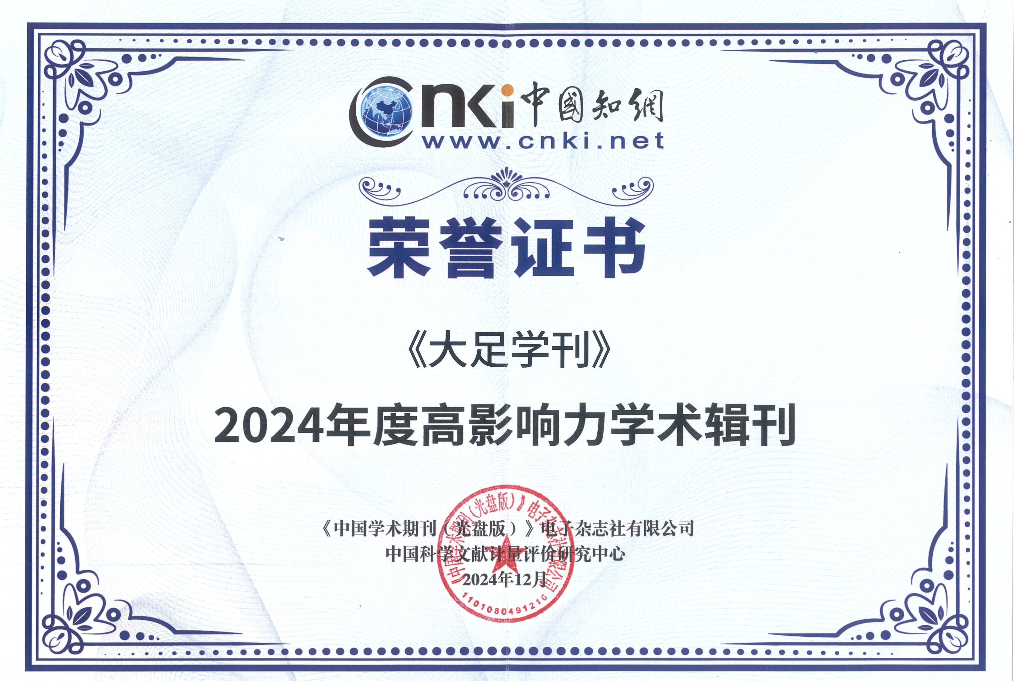 《大足学刊》入选“2024年度高影响力学术辑刊”荣誉证书