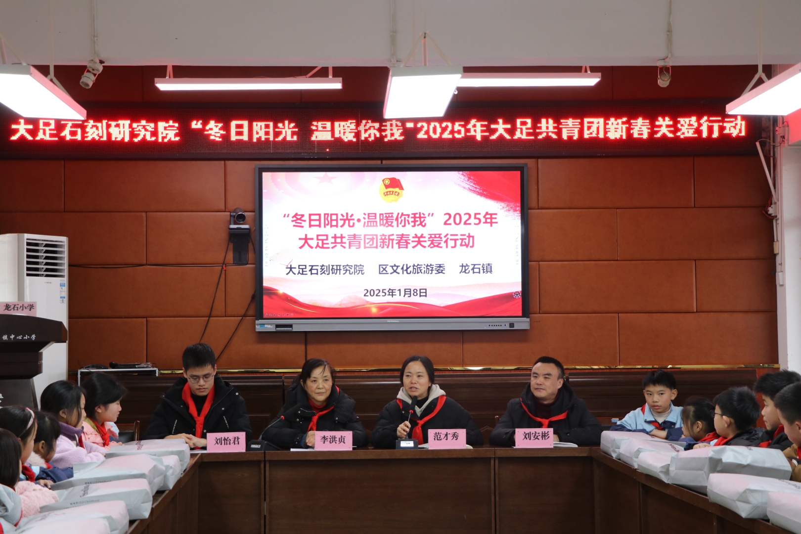 1月8日,大足石刻研究院团支部与区文化旅游委、龙石镇人民政府走进龙石小学,开展“冬日阳光·温暖你我”2025年新春关爱行动,为60名留守儿童、家庭困难学生送上新年礼物。