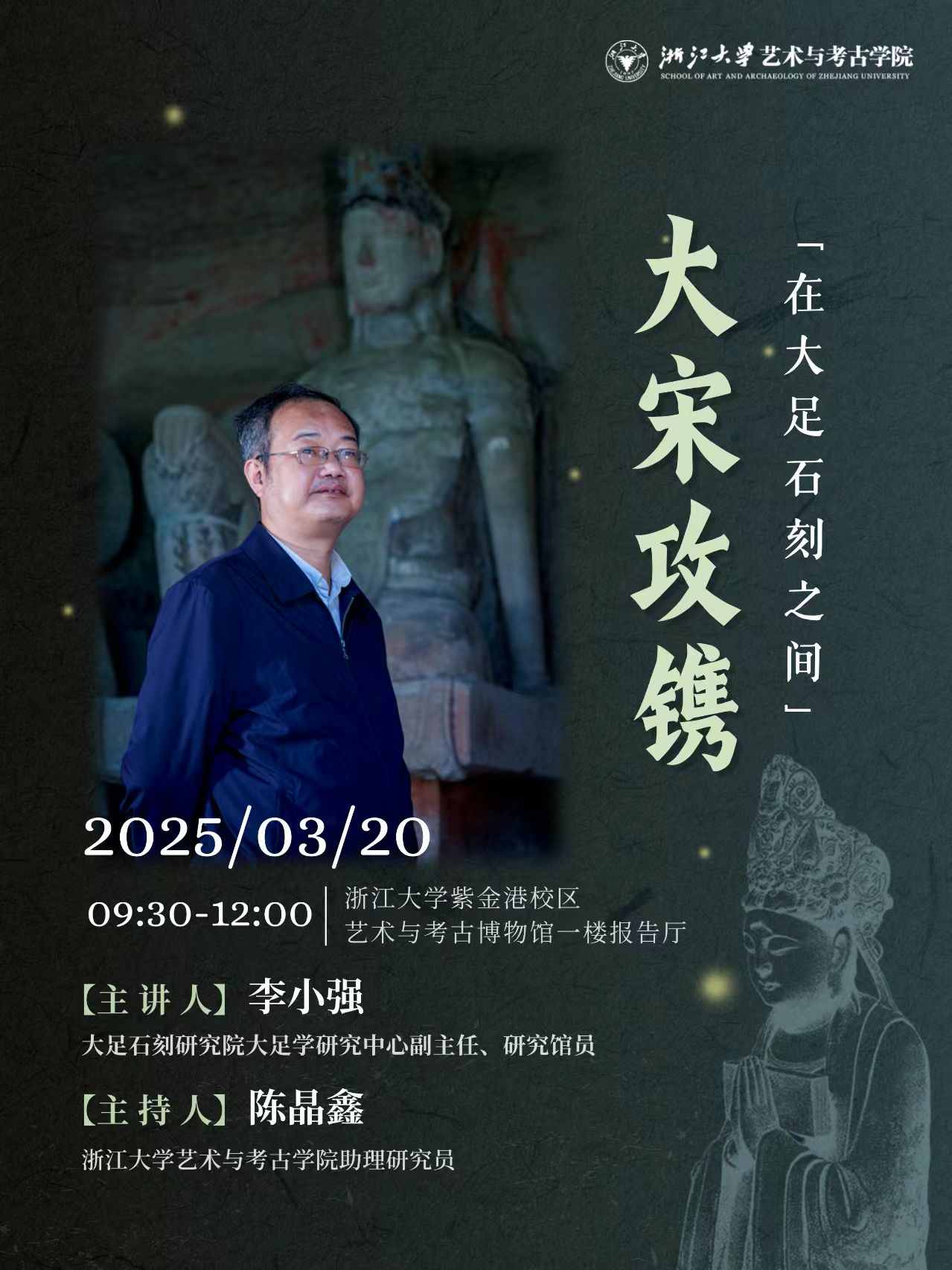 3月20日,“大宋攻镌——在大足石刻之间”主题讲座在浙江大学紫金港校区艺术与考古博物馆拉开帷幕。本次讲座由大足石刻研究院与浙江大学艺术与考古学院联合主办,是双方继2021年在石窟寺保护研究领域开启科教融合创新发展合作以来,又一次携手共书学术交流新篇,为千年石刻艺术与现代学术研究搭建对话平台。