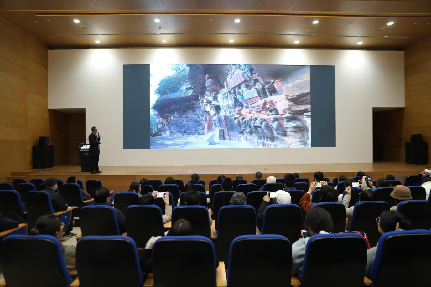 讲座由大足石刻研究院大足学研究中心副主任、研究馆员李小强担任主讲人,他以一幅大足石刻全景图为引,带领现场一百二十余名师生及观众走进了巴蜀山崖间的艺术秘境。从宋代工匠“攻镌”的自我称谓切入,揭秘大足石刻背后文、伏两姓家族跨越川渝的雕刻传奇,解析大足石刻儒释道三教融合的独特风貌,展现古代科技与石刻造像的精妙结合,以工匠的独特视角揭开世界文化遗产的瑰丽面纱,生动呈现了一场"来自大足石刻工匠迟到800年的艺术汇演"。