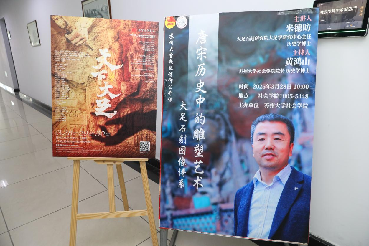 3月28日上午,大足石刻文化推介进高校专题讲座之“唐宋历史中的雕塑艺术——大足石刻图像谱系”走进苏州大学社会学院。活动现场座无虚席,百余名师生齐聚一堂,共同探寻大足石刻的艺术密码与历史价值。