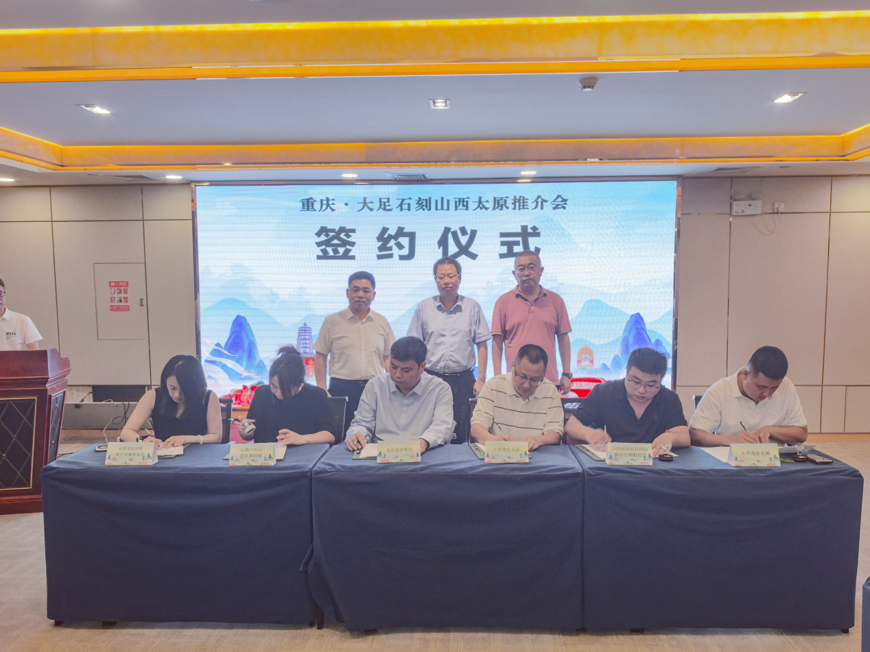 与会人员通过深入座谈交流,进一步了解了大足石刻在山西的市场前景,30多家旅行商代表踊跃建言献策,就大足石刻的宣传推广、产品线路、政策配套等提出了系列建议,为大足石刻打开山西市场提供了重要参考。两地文旅单位达成了普遍的合作共识,其中山西携程百事通国际旅行社有限公司、山西户外行旅行社有限公司、山西悦享假日旅行社有限公司、山西逸旅国际旅游有限公司、山西沃航国际旅行社有限公司与大足石刻文旅集团签订旅游市场战略合作协议,将通过宣传营销和渠道优势共同开拓旅游市场。