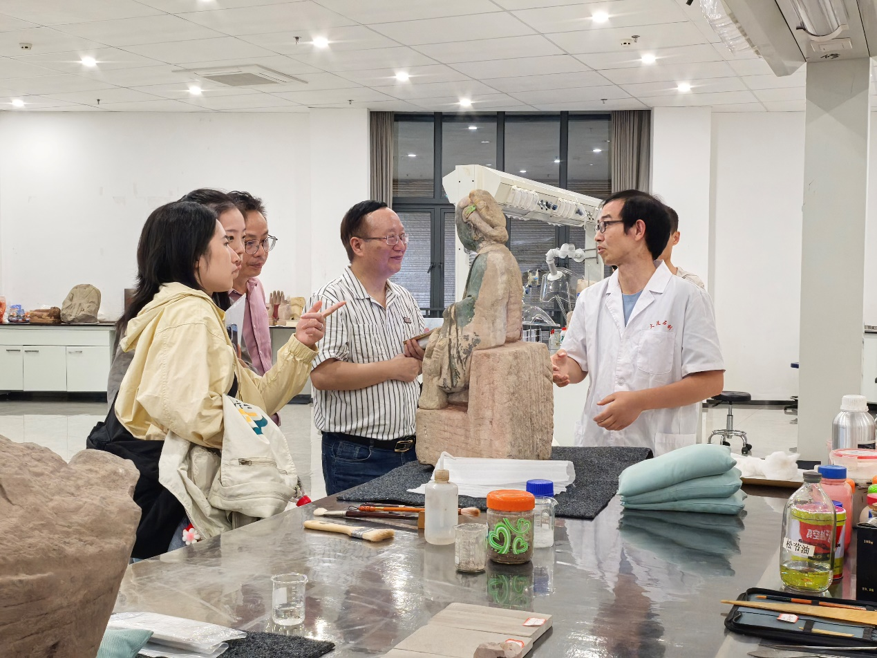 在大足石刻文物医院,文博馆员刘小雨介绍了大足石刻科技保护知识、文物保护修复设备以及模拟不同气象环境下的病害成因及治理实验。在石质文物修复室,“中国好人”文物修复师彭柳升坐在修复台边模拟绘制石刻彩绘,他介绍了石质文物修复基本方法并展示了修复技艺。科普爱好者通过沉浸式体验,体会到不同气象环境是文化遗产科技保护必须重视的因素,同时也增强了对文物保护科技的深度认知和对文化遗产传承的情感共鸣。