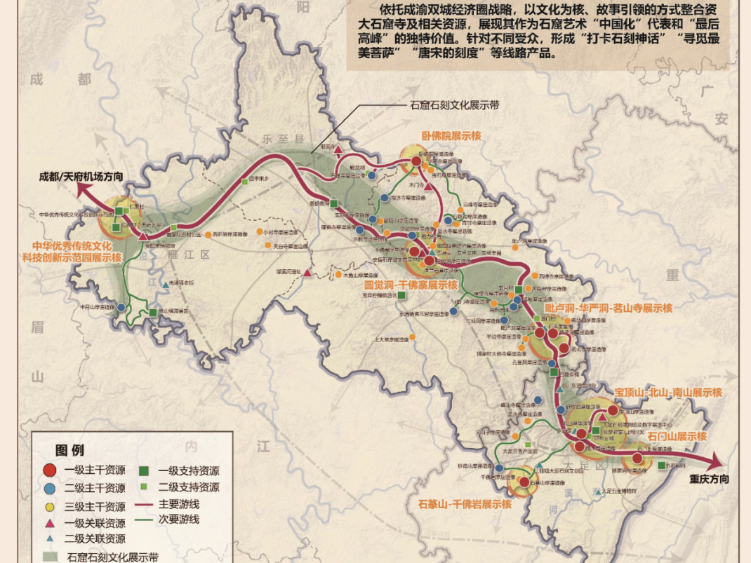 近日,国际古迹遗址日主场活动在山东省泰安市举行,国家文物局、文化和旅游部、国家发展改革委联合发布了2024年度全国优秀文物主题游径名单,资阳大足石窟石刻文物主题游径成功入选。资阳大足石窟石刻文物主题游径总路线图资阳大足石窟石刻文物主题游径依托四川资阳和重庆大足丰富的石窟石刻资源,具有极高的石窟石刻艺术价值和文化旅游价值。安岳石窟华严洞安岳石窟茗山寺大足石刻千手观音大足石刻释迦涅槃圣迹图资阳大足石窟石刻文物主题游径高度融合成渝地区双城经济圈与巴蜀文化旅游走廊建设,将川渝两地最具优势的石窟与农文旅资源有机结合,形成集文化体验、旅游观光为一体的特色游径,更好展现石窟艺术中国化魅力与地域文化特色。游径涵盖51处文物和文化遗产主干资源(石窟寺文物)、关联资源15处(支撑主题呈现的其他文化遗产和展示场馆)。资阳大足石窟石刻文物主题游径建设以强化重庆和四川两地间的历史文化纽带和文旅经济发展为抓手,将有效促进川渝两地在石窟寺保护管理、展示利用和文旅融合等方面的全面合作,推动构建巴蜀文化旅游走廊标识体系,助力成渝地区双城经济圈建设,为文物保护和文旅融合的跨省协作提供示范。据了解,2024年度优秀文物主题游径推介工作由国家文物局、文化和旅游部、国家发改委联合组织开展。自启动以来,全国共收到申报案例122个,最终遴选出32个优秀案例作为推介。