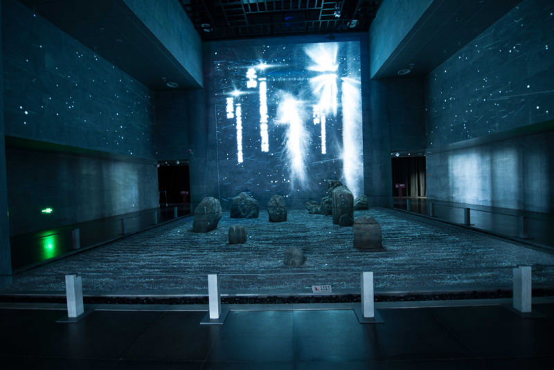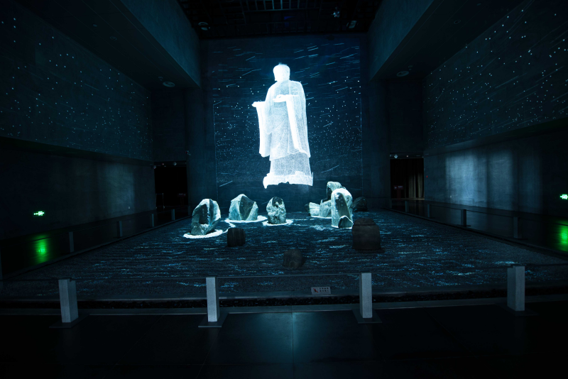 本单元通过宏观全景至微观局部再现的“一沙一世界”装置,概览大足石刻艺术魅力。在光影变幻中呈现大足石刻于宗教、文学、艺术、历史、哲学、科学、建筑、民俗等诸多领域的丰富价值。
